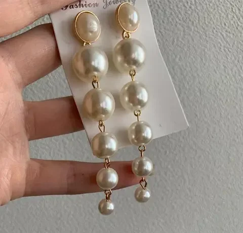Long Pearl Drop Dangle Earrings.
