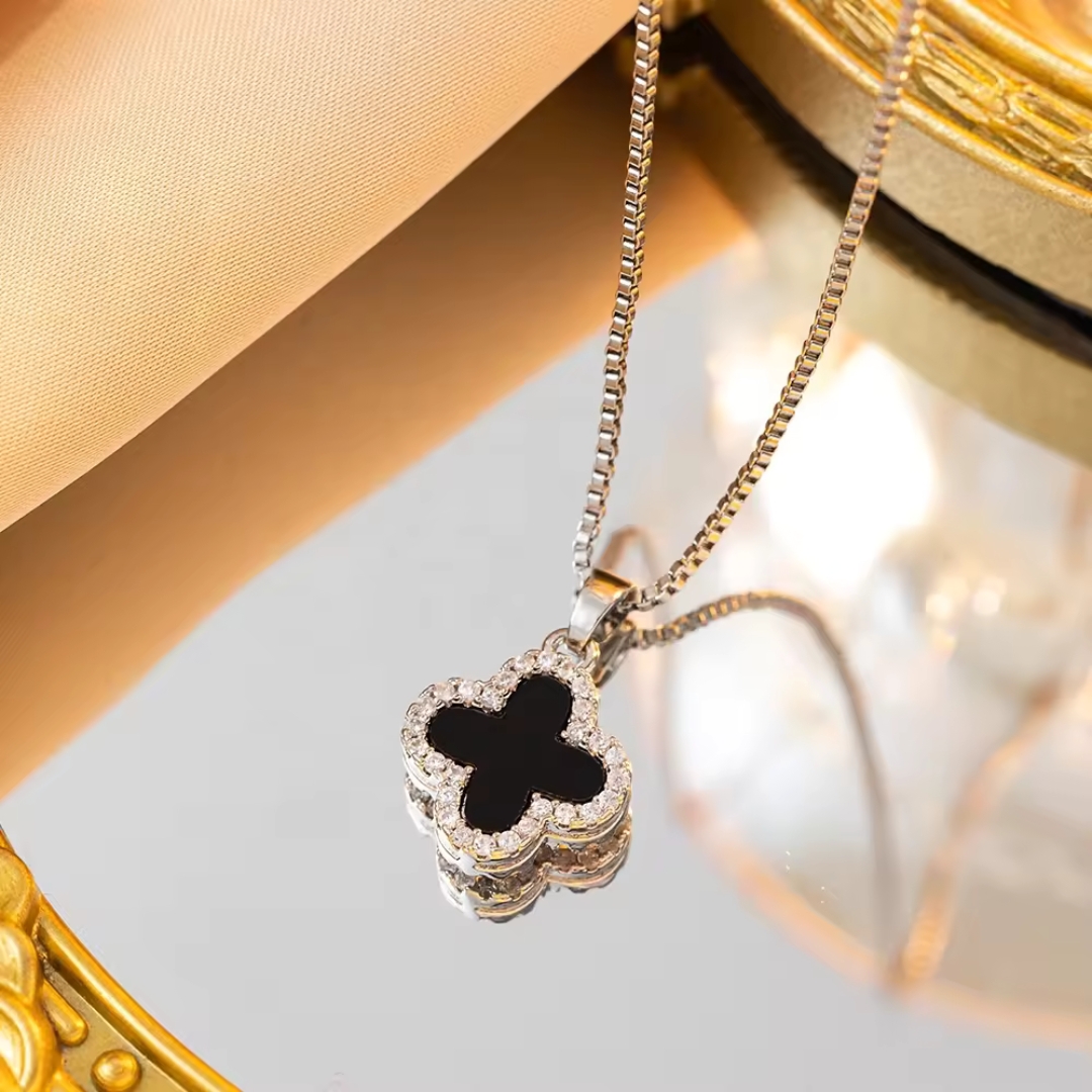 “925 Sterling Silver Black Four-Leaf Clover Pendant Necklace with Cubic Zirconia Accents”