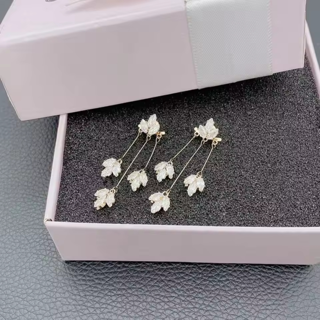 Embrace nature-inspired elegance with the Crystal Leaf Drop Earrings, also known as Gold Plated Crystal Leaf Dangle Earrings, crafted with exquisite Korean design aesthetics. These beautiful earrings feature delicate leaf-shaped charms encrusted with sparkling crystals, suspended from a graceful gold-plated chain. The shimmering crystals catch the light with every movement, adding a touch of sophistication and charm to your look. Lightweight and comfortable, these earrings are perfect for both everyday wear and special occasions. Whether paired with casual outfits or elegant evening wear, the Crystal Leaf Drop Earrings bring a refined, fresh, and feminine touch that complements any style.