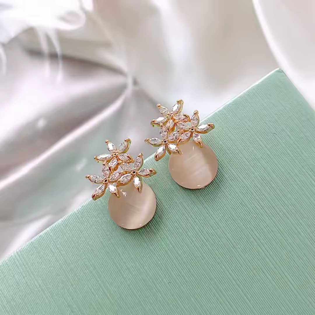 Experience ethereal beauty with the Floral Crystal and Moonstone Dangle Earrings, inspired by delicate Korean jewelry craftsmanship. These enchanting earrings feature intricate floral motifs adorned with shimmering crystals that catch the light, paired with luminous moonstone drops that add a mystical glow. The elegant dangle design creates graceful movement, perfect for adding a touch of romance and sophistication to any outfit. Lightweight and comfortable, they’re ideal for both special occasions and everyday wear. Combining natural elements with refined sparkle, these earrings bring a dreamy, feminine charm that beautifully complements modern Korean fashion and timeless elegance.