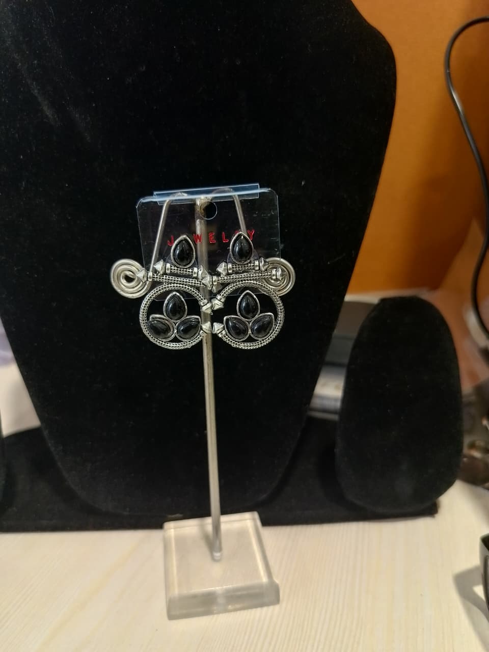 These oxidized silver earrings with black stones are an exquisite fusion of bohemian charm and traditional elegance. The darkened silver finish gives them an antique look, beautifully setting off the deep black stones that catch the light with subtle sparkle. Their detailed craftsmanship includes delicate filigree or textured metalwork, offering dimension and depth. Lightweight and comfortable, they sway gently with each movement, perfect for both festive occasions and everyday wear. Pair them with ethnic outfits or modern fusion styles to add a touch of edginess and grace. A versatile addition to any jewellery collection.