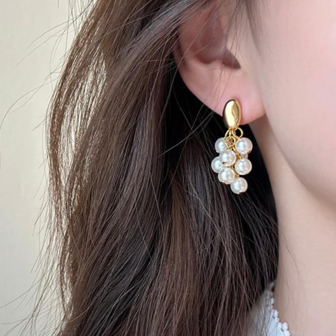 Add a touch of timeless elegance with the Pearl Cluster Drop Earrings, inspired by the refined beauty of Korean jewelry design. These stunning earrings feature a delicate cluster of lustrous faux pearls that cascade gracefully, creating a charming drop effect. The arrangement of pearls adds depth and sophistication, making them perfect for both everyday wear and special occasions. Lightweight and comfortable, they effortlessly elevate any outfit with a classic yet modern flair. Whether paired with casual attire or elegant evening wear, these earrings embody the perfect balance of grace and style, making them a must-have accessory for those who appreciate subtle luxury.