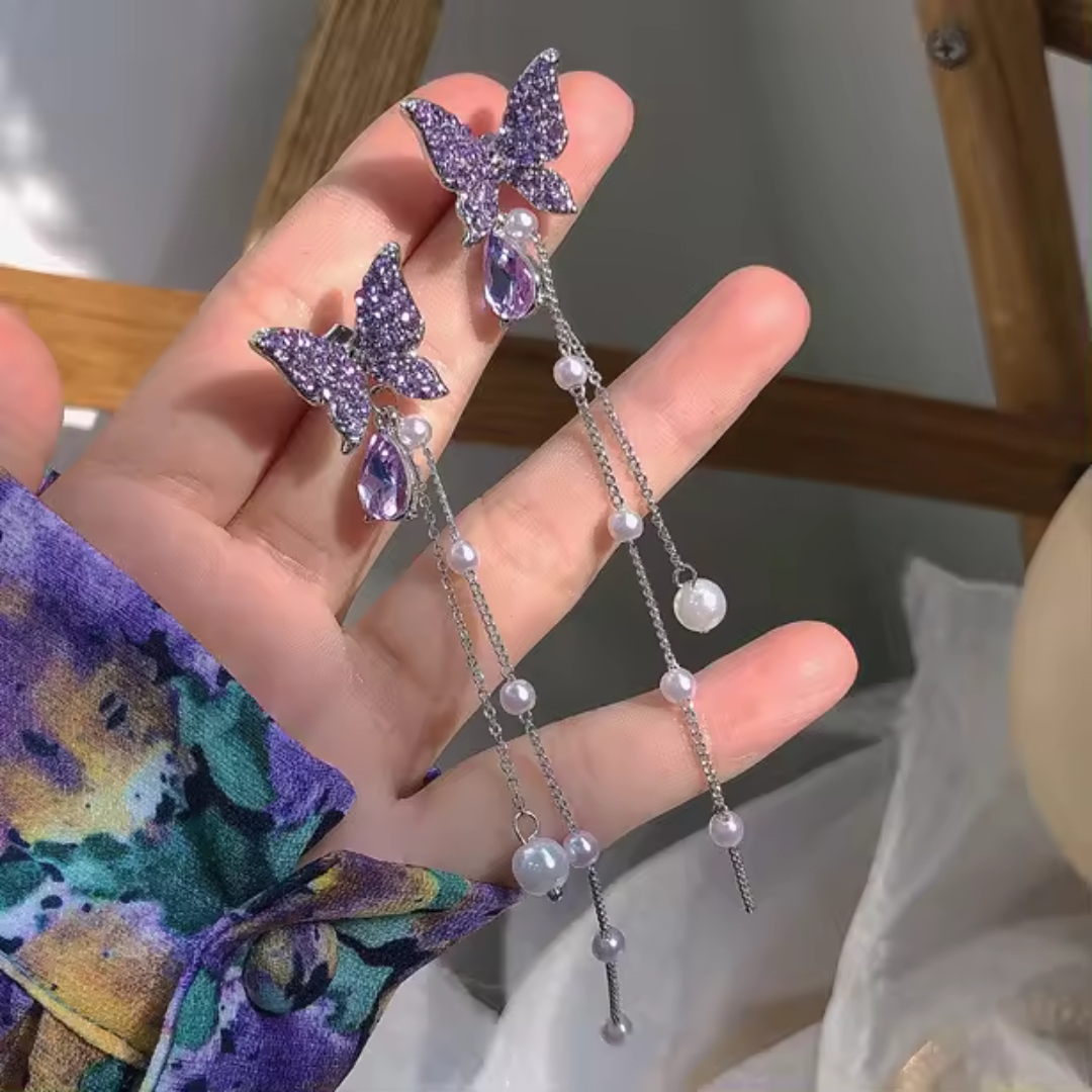 Purple Butterfly CZ/Rhinestone Pearl Tassel Dangle Earrings.
