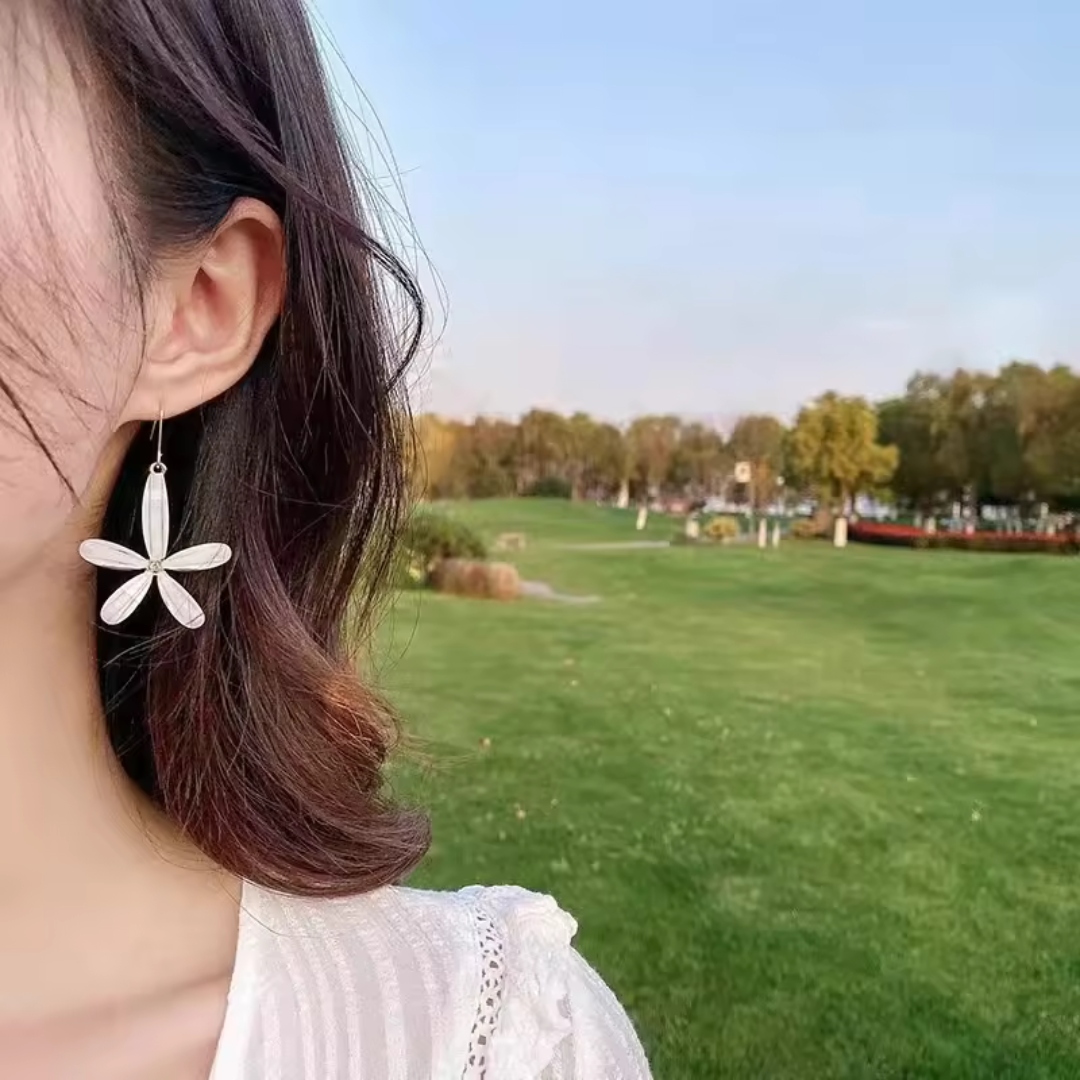 Embrace delicate beauty with the White Flower Drop Earrings, a graceful accessory inspired by the elegance of Korean jewelry design. These charming earrings feature intricately crafted white flower motifs that gently dangle, adding soft movement and a touch of femininity to your look. The floral design symbolizes purity and grace, making them perfect for springtime outfits, romantic occasions, or everyday wear. Lightweight and comfortable, they effortlessly elevate both casual and dressy ensembles. Whether paired with a sundress or an evening outfit, the White Flower Dangle Earrings bring a fresh, elegant charm to your style—perfect for women who love soft, nature-inspired fashion.