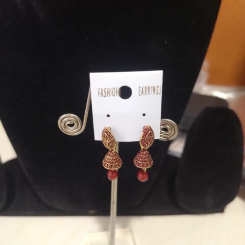 gold-polished Jhumka earrings with red bead detailing