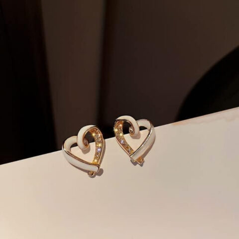 Heart-Shaped Stud Earrings, White Enamel with Gold-Tone Border