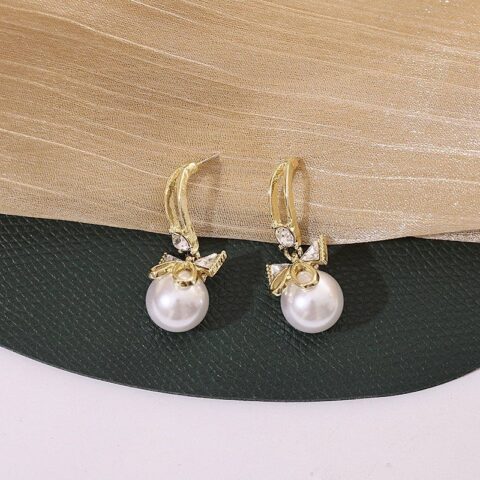 JJK 50 Gold Plated Pearl Bow Drop Earrings with Rhinestones.