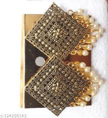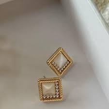 Square Gold-Toned Pearl Stud Earrings with Rope Twist Border.