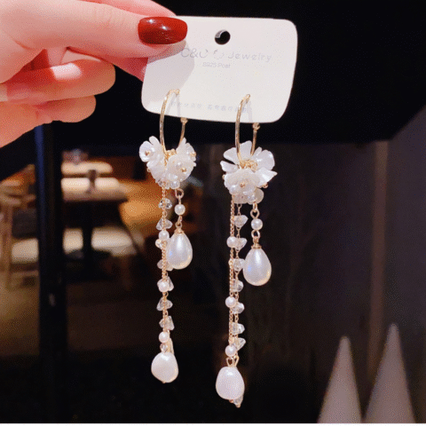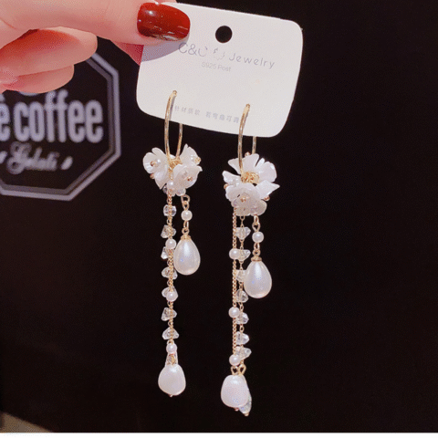 C&C Jewelry White Flower and Pearl Long Drop Earrings.