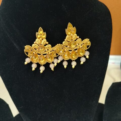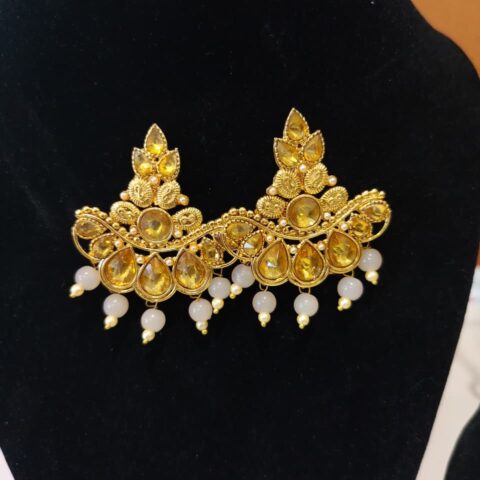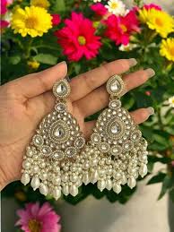 Chandbali, Jhumka, or Kundan earrings.